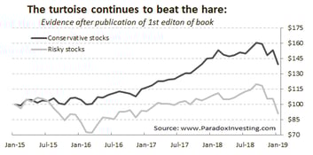 Since the publication of the first edition of the book we have maintained a dataset that highlights the returns of Conservative and Risky stocks. Since 2015 the tortoise continues to beat the hare, despite the fact the hare seems to have had some extra energy over the last few years.